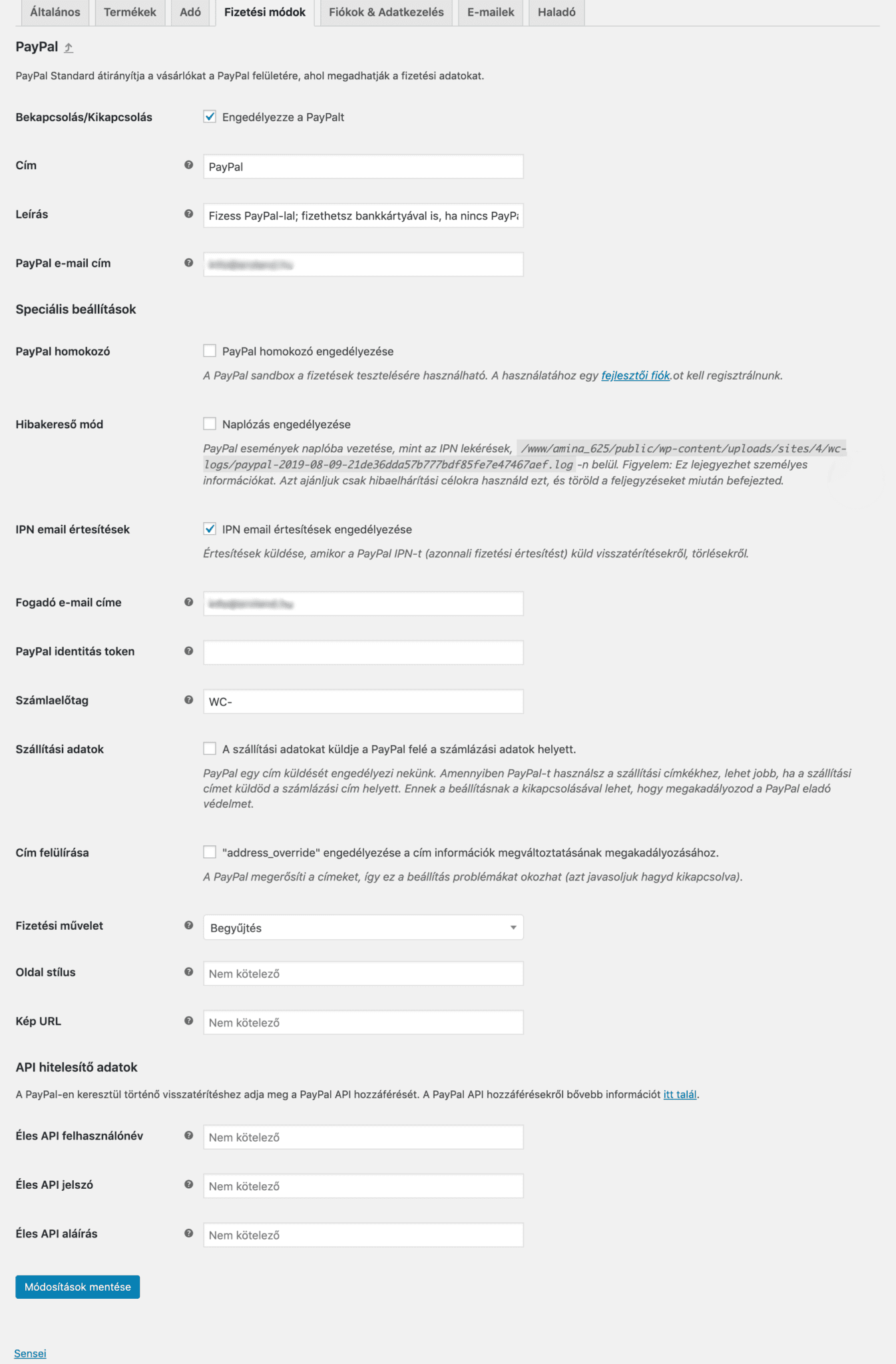 - Nincs túl sok feladat a beállításokkal. Szinte elegendő csak az élő céges PayPal fiókod e-mail címét megadnod 2 helyen (PayPal e-mail cím és Fogadó e-mail címe) és elmenteni a változásokat és már működik is a PayPal-os fizetés. Az alábbi képen látható módon állítsd be a többi opciót: