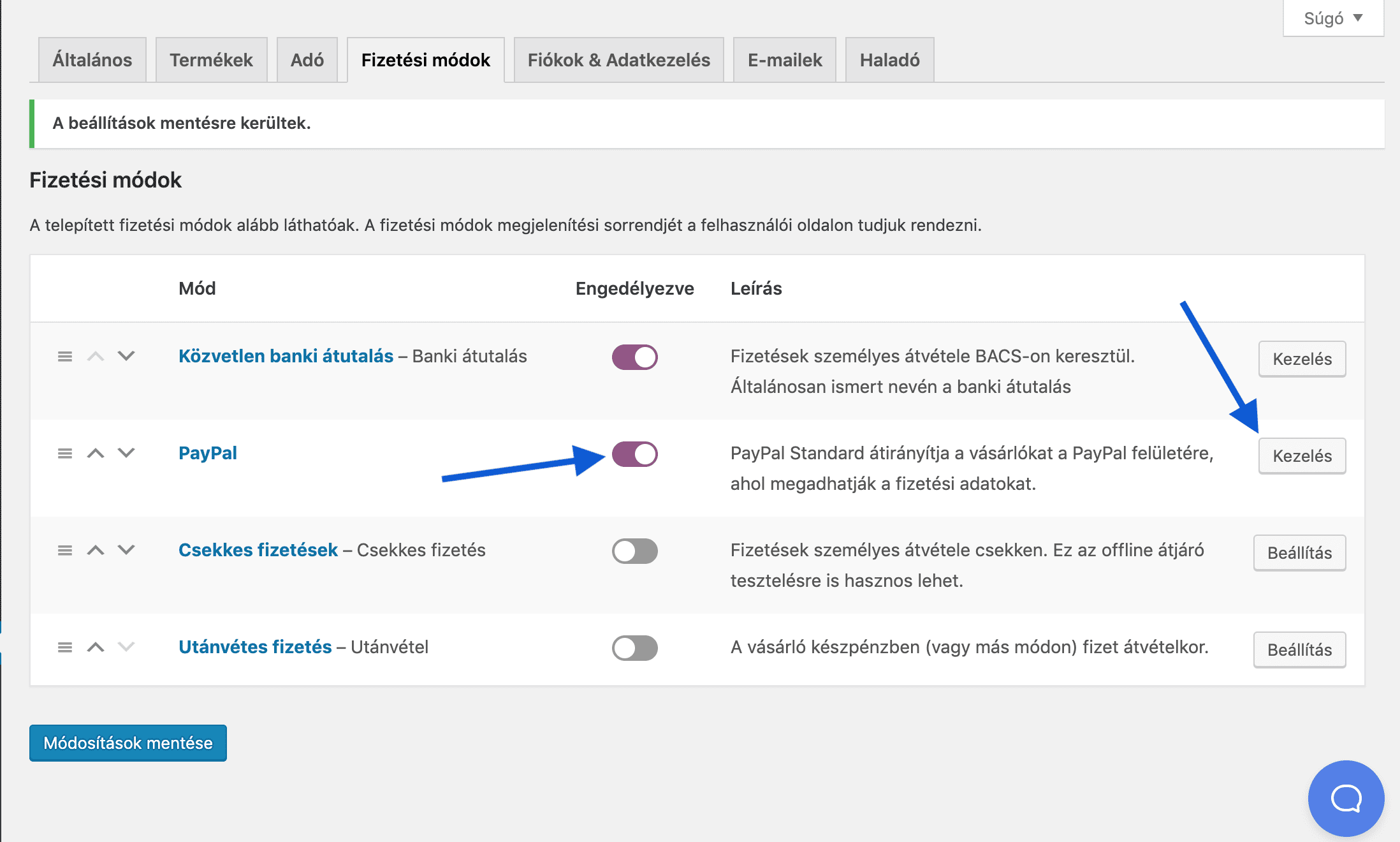 - A WooCommerce » Beállítások » Fizetési módok fülön a PayPal sorban lévő kapcsolót kapcsold be (húzd jobbra). Majd kattints a sorban a Kezelés gombra:
